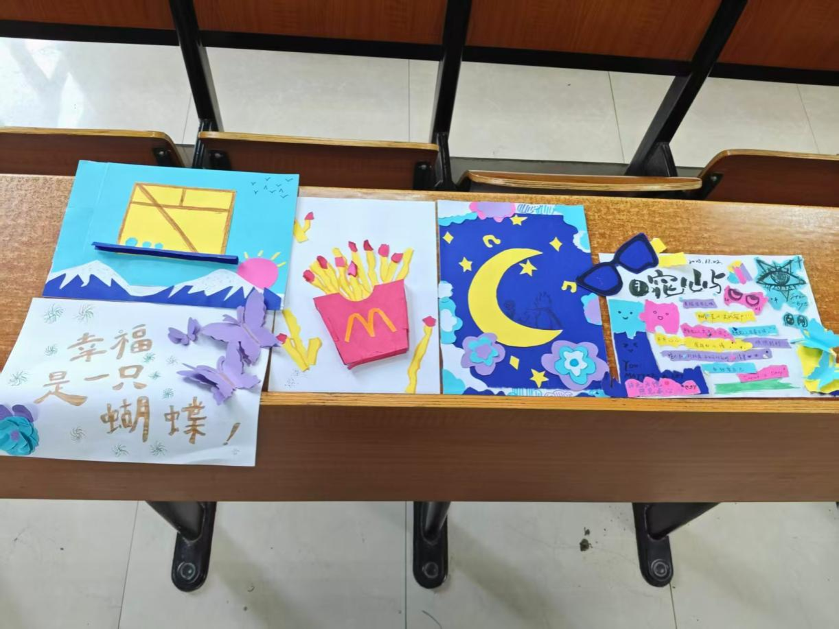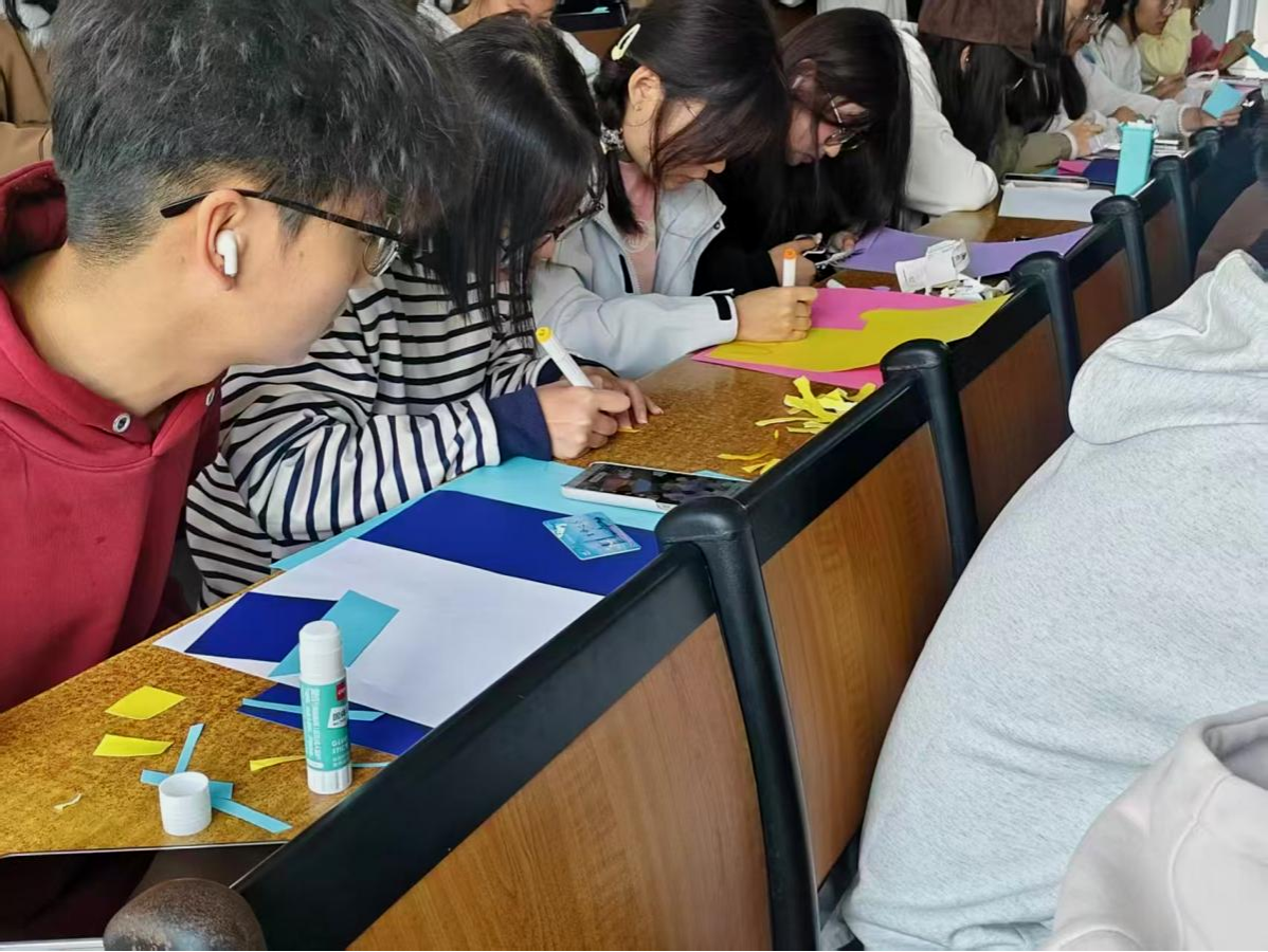 活动中,参与者暂别专业学习中的理性思维,通过杂志、彩纸、布料等材料的裁剪重组,将“说不出口的心里话”“藏于心底的期盼”转化为专属“心灵拼贴画”。从迷茫的色块拼接,到清晰的主题呈现,不少同学表示:“不用会画画,也能把说不出口的情绪‘画’出来,特别放松。”创作结束后,部分同学主动分享作品背后的故事,从寓意学业压力的“色块”聊到象征期许未来的“星空”,拼贴画成了情绪生动的“翻译器”,让理科生含蓄的情绪以轻松具象的方式表达。