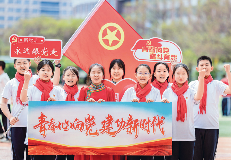 图为2024年4月30日,内蒙古自治区呼和浩特市第二十六中学举行“赓续五四精神 争做时代新人”纪念五四运动105周年主题团日活动。 人民图片 丁根厚/摄