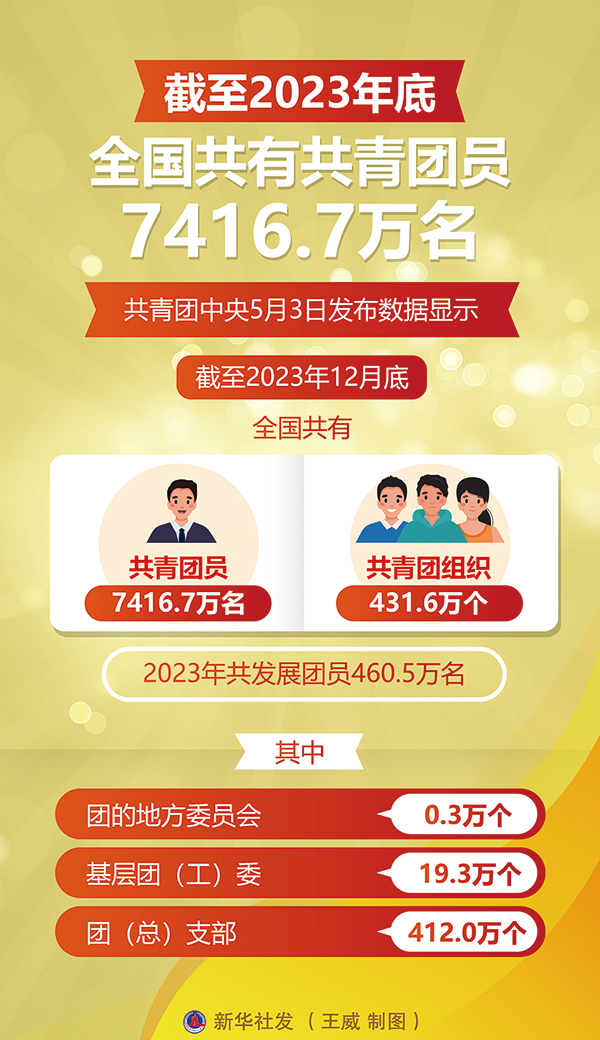 共青团中央2024年5月3日发布的数据显示,截至2023年12月底,全国共有共青团员7416.7万名,共青团组织431.6万个。2023年共发展团员460.5万名。 新华社发 王威/制图